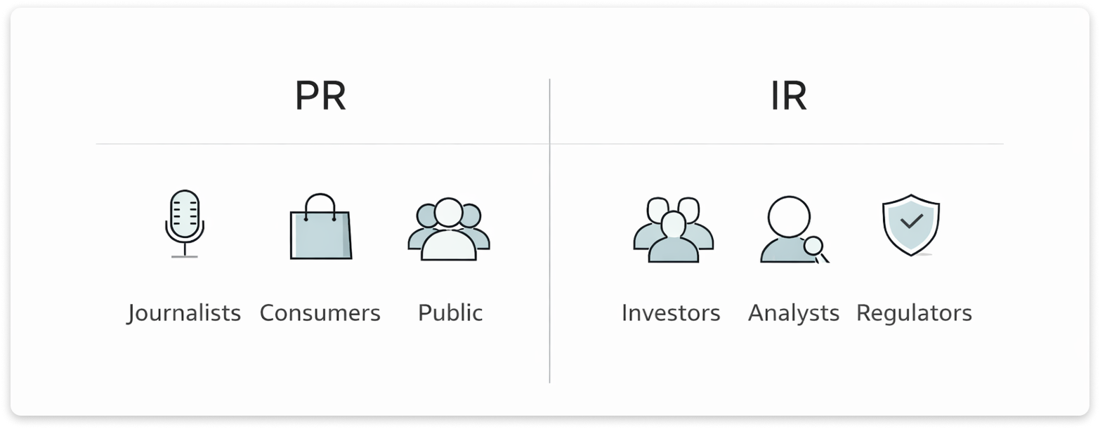 Both IR and PR are communication functions, but they serve different audiences with different expectations.